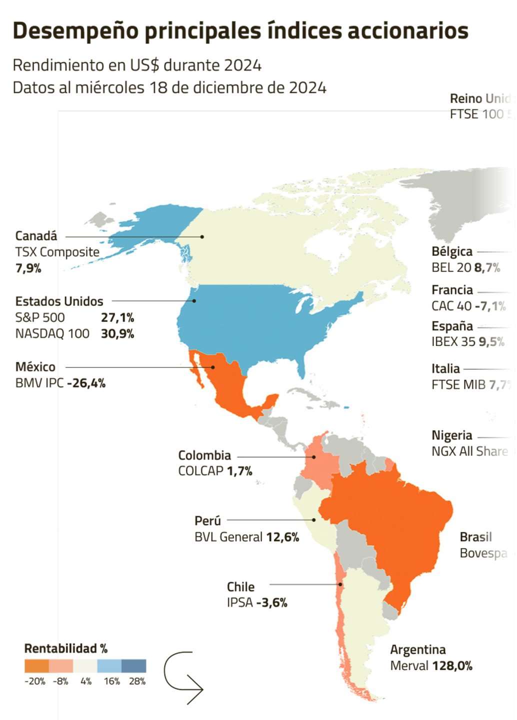 Así les fue a las bolsas mundiales en 2024: ¿qué mercados lideraron las rentabilidades?