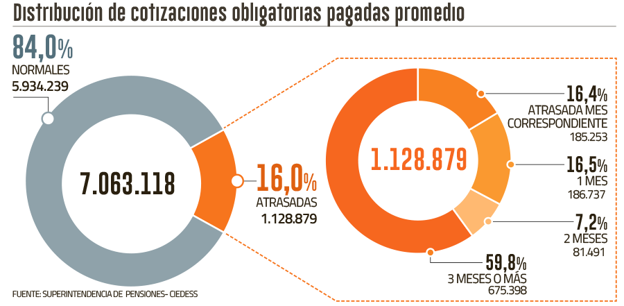 De acuerdo con el análisis de Ciedess, en 2022 se registraron 7.063.118 aportes obligatorios pagados, de los cuales el 84% se realizó de manera normal (5.934.239), mientras que el 16% restante (1.128.879) se canceló fuera del plazo legal. De estos últimos, el 16,4% correspondieron a cotizaciones con atraso de un mes, mientras que el 59,8% presentó atraso de tres meses o más.