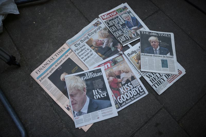 Los periódicos que informan sobre la renuncia de Boris Johnson se ven en el apartamento de Downing Street en Londres, el 8 de julio de 2022. Foto: Reuters