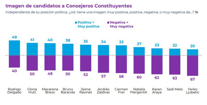 Sin embargo, en torno a la imagen positiva que se tiene de los candidatos, ninguno supera el 50%, siendo el exministro del Interior, rodrigo delgadoque alcanza el 49%, seguido del presidente de Evópoli, gloria huttcon un 41%.