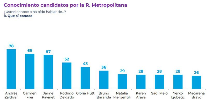 Consultados por los candidatos de la Región Metropolitana al Consejo Constitucional, el 78% ha oído hablar del exministro Andrés Zaldívar69% al exsenador carmen frei y el 67% al exjefe de Defensa, Jaime Ravinetsiendo el más conocido respecto al Distrito Senatorial No. 7.