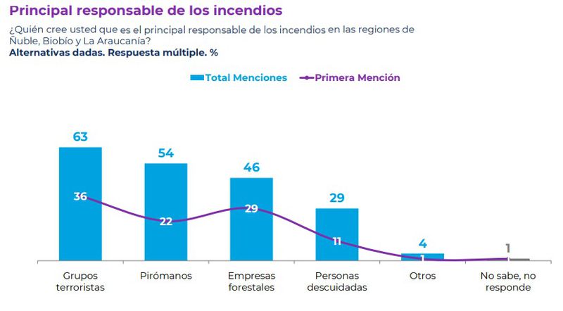 Además, 94% cree que los accidentes son causados intencionalmente por personas. En este sentido, el 63% piensa que la grupos terroristas son los principales responsables de los incendios, el 54% apunta a pirómanos y otro 46% lo atribuye a la empresas forestales.