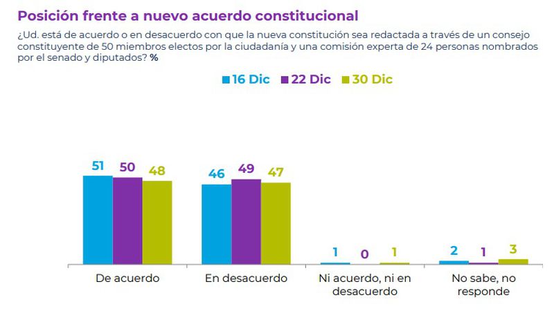 Por otro lado, El 48% de los encuestados aprueba que la nueva Constitución sea redactada a través de un consejo constituyente de 50 miembros electos y una comisión de expertos de 24 personas designadas por el Senado y la Cámara de Diputados, mientras 47% rechaza esta opción.