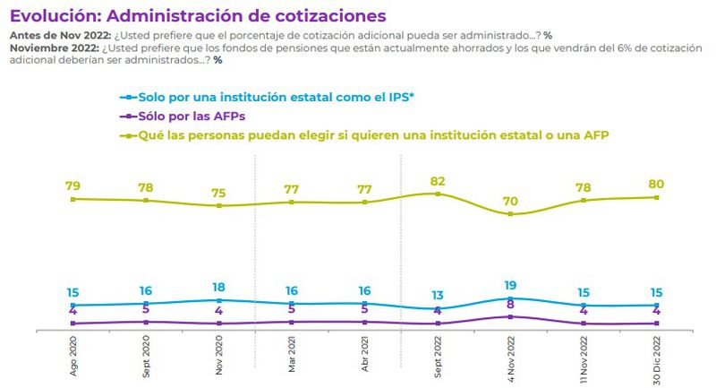 Finalmente, El 56% de los consultados prefiere que el 6% extra de cotizaciones que pagará el empleador vaya íntegramente a cuenta de los trabajadores. Asimismo, el 80% está a favor de que las personas puedan elegir entre una institución estatal y una AFP para la administración de estos fondos.