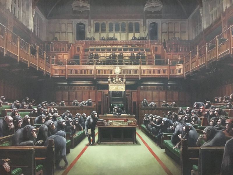 Otra de sus obras más destacadas es devolver el parlamento, donde reproduce el destacado parlamento británico pero con monos en lugar de parlamentarios. El cuadro fue otra de las obras millonarias del creador, ya que en 2019, y nuevamente en la casa de subastas Sotheby’s, el fresco se vendió por 12 millones de dólares (alrededor de 10 mil millones de pesos chilenos).