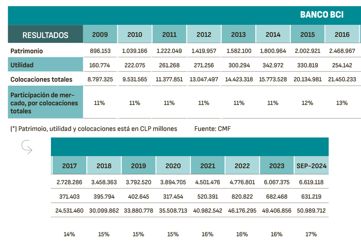 Durante su gestión, en los últimos 10 años, el monto total de préstamos bancarios de Bci se multiplicó por 3,2 veces, alcanzando en septiembre de este año $50.989 millones. Además, su cuota de mercado aumentó 6 puntos porcentuales, del 11% al 17%. Por otro lado, sus activos se multiplicaron 3,7 veces, tras reportar $6.619 millones.