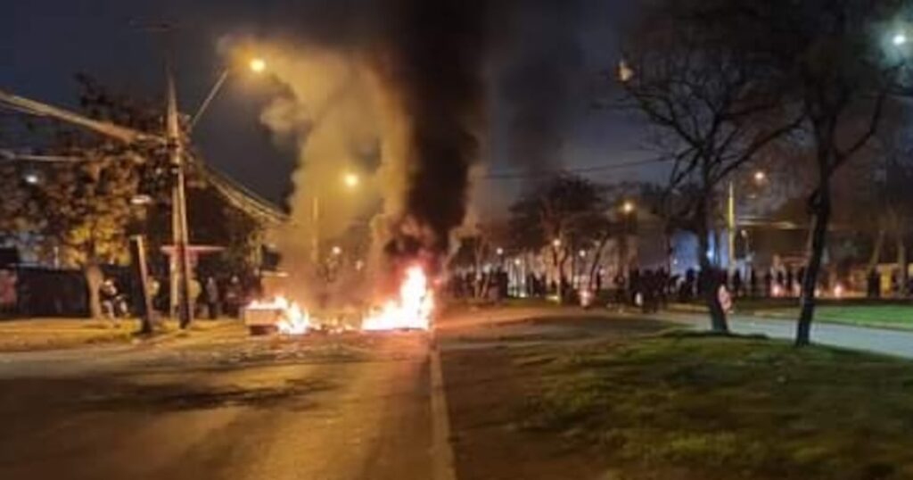 En el sector, además, se ha reportado el lanzamiento de artefactos incendiarios y juegos pirotécnicos contra uniformados, que se personaron en la zona para atender los disturbios.
