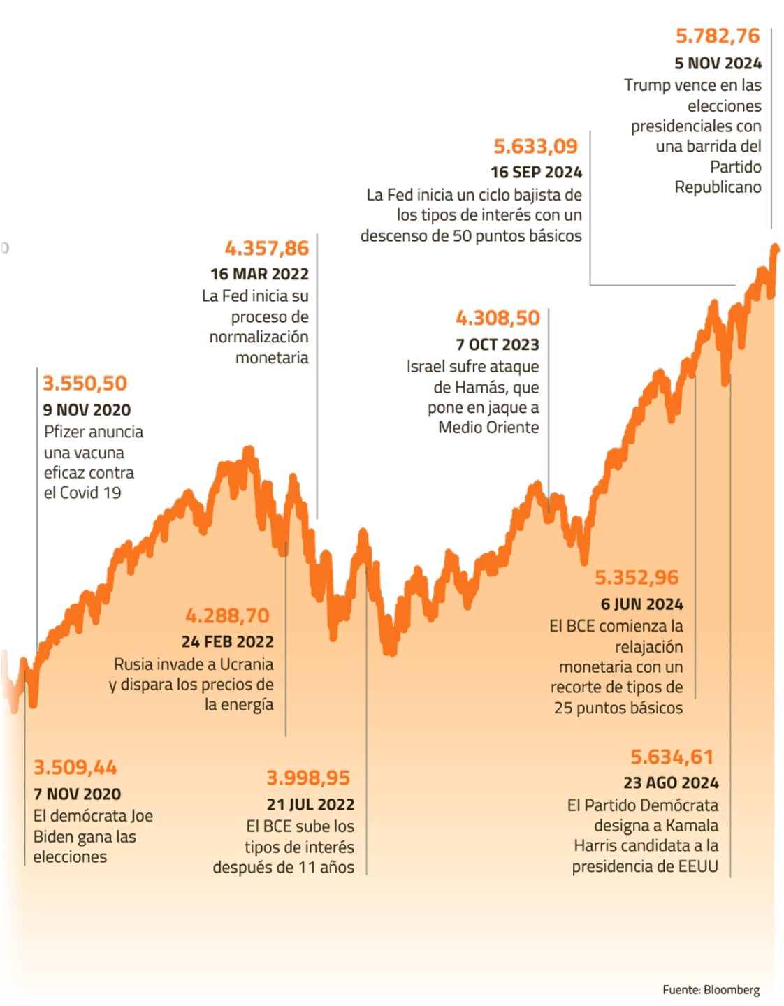 Los principales índices de Wall Street reaccionaron el miércoles 6 de noviembre con fuertes alzas tras la aplastante victoria del Partido Republicano en las elecciones presidenciales y legislativas del pasado martes en Estados Unidos. Sus ganancias oscilaron entre el 2,53% del S&P 500 y el 3,57% del Dow Jones.