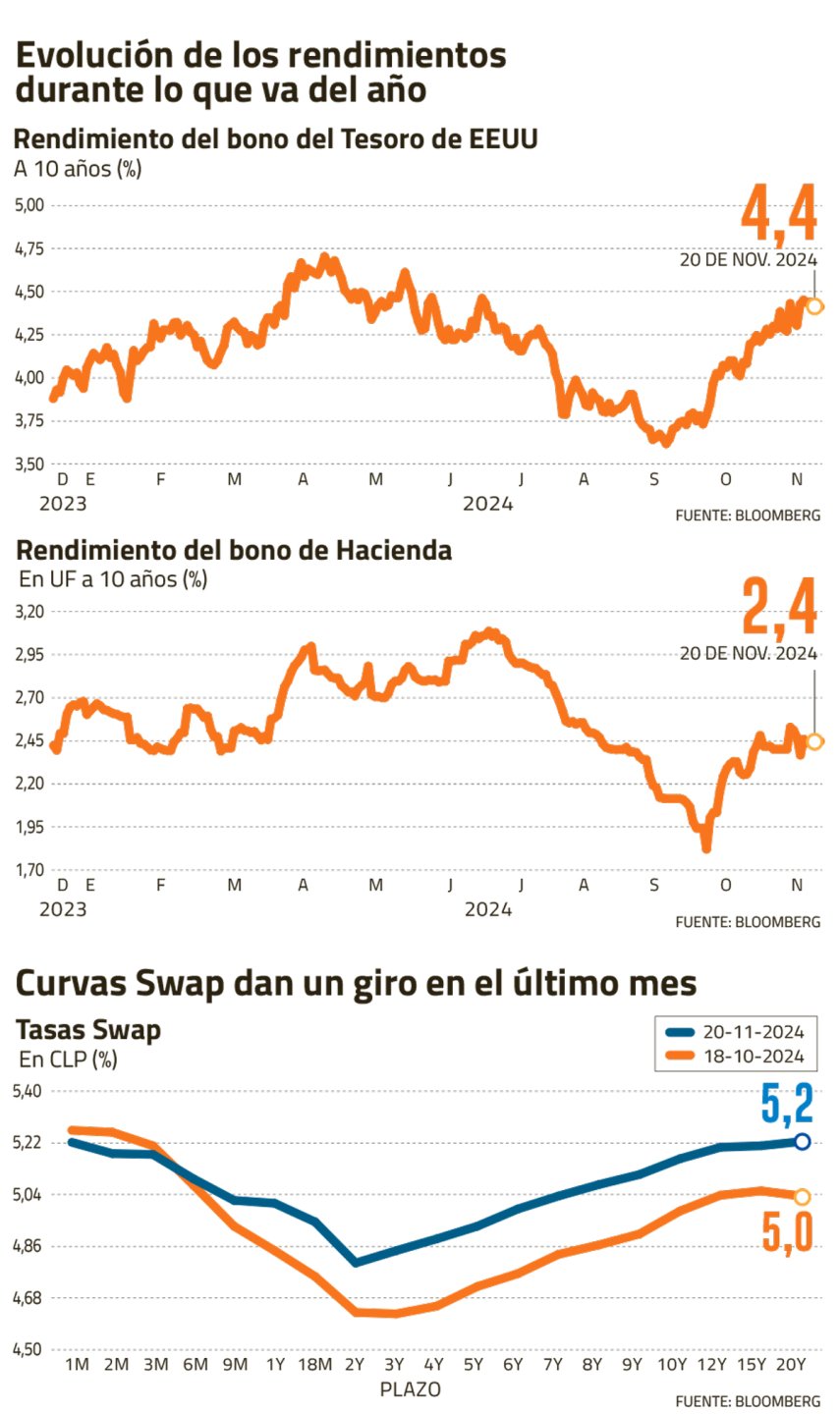 El cambio en las proyecciones internacionales tuvo un efecto inmediato en el escenario local, especialmente en las tasas de largo plazo. Entre inicios de octubre y esta semana, el rendimiento del bono del Tesoro a 10 años en UF pasó de 1,9% a 2,4%.