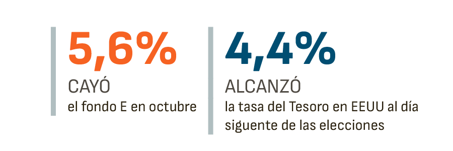 Semanas antes de las elecciones estadounidenses, la renta fija mundial empezó a sufrir. La ventaja en las encuestas del entonces candidato Donald Trump, sumada a la fortaleza de la economía estadounidense, llevó a que la tasa del Tesoro estadounidense a 10 años saltara del 3,7% al 4,3% durante octubre, impulsando a la baja los rendimientos de los instrumentos de renta fija.