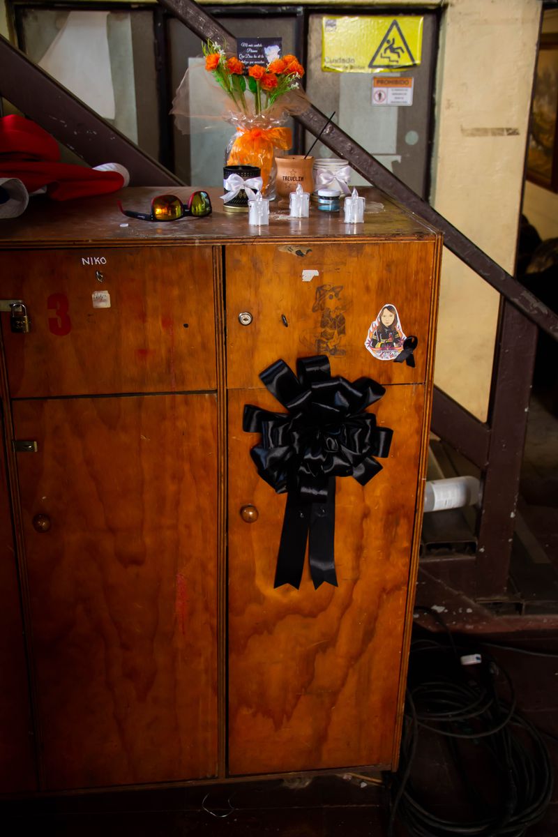 Ese silencio permite descubrir su casillero, el lugar de oración que se escogió para despedir a la “Yesi” o la “mami” como le decían algunos, producto de los consejos y llamados de atención sin filtro que hacía a diario. El locker se cerró con llave y se puso un cinta negro tipo flor acompañado de una calcomanía-que fabricó una vecina del cuartel-que representa a Muñoz como una heroína. Arriba aún quedan rastros de las velas que se prendieron y algunas de sus pertenencias como gafas de sol, una tasa de mate y un pañuelo.