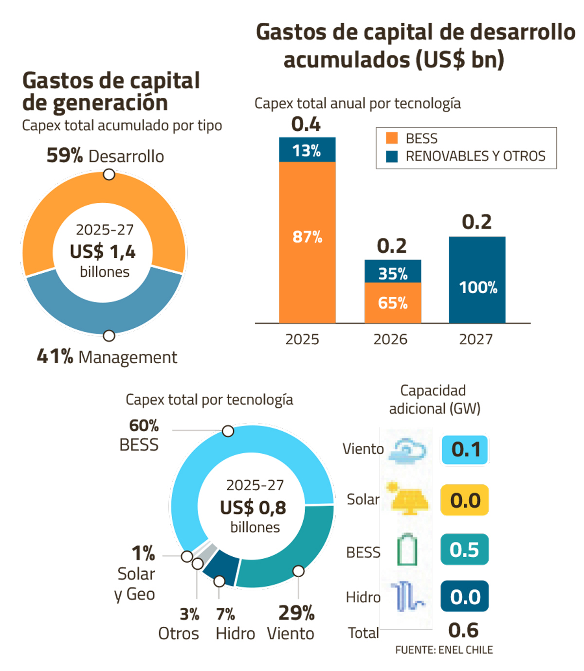 El plan de inversiones para el período, en tanto, contempla US$ 1.800 millones distribuidos en: 32% en renovables, 27% en sistemas de almacenamiento de energía (BESS), 23% para el negocio de distribución, 18% para nuestro parque térmico y 2% en Enel. X y otras inversiones.