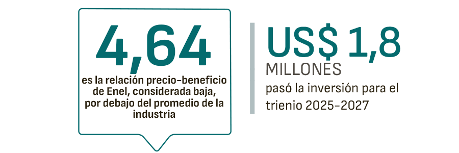 Enel también informó los rangos de Ebitda que la compañía puede alcanzar en cada uno de los años del próximo trienio: US$ 1,4 mil millones y US$ 1,5 mil millones en 2025; de 1.300 millones de dólares a 1.500 millones de dólares en 2026; y de US$ 1.400 millones a US$ 1,6 millones en 2027. Según Francisco Domínguez, analista senior del sector eléctrico de Bci, estas proyecciones son “bastante interesantes” porque “la empresa establece métricas mucho más estabilizadas que las anteriores . Antes veíamos una pendiente que estaba un poco más presionada a largo plazo, ahora parece bastante estable”, afirma.