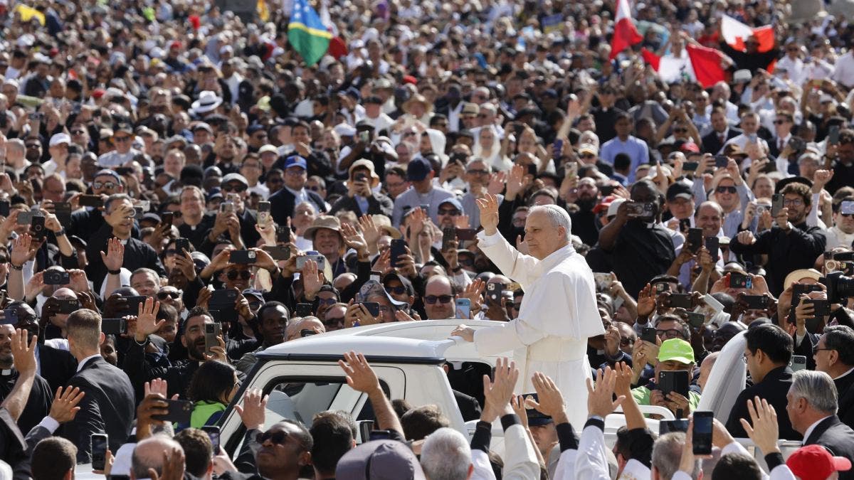 Leo xiv Tiró de gira, rodeado por más de 20 hombres del gendarmería del Vaticano, los pasillos de la plaza y llegó al final de los adyacentes a través de Della Conciliazione, donde los fieles se congregaron que no entraron en la plaza y que seguirán la ceremonia de las pantallas gigantes que se instalaron estos días.