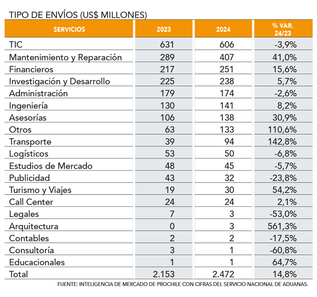 El mundo fue un buen socio para el comercio chileno durante el año pasado, pero no solo para la venta de bienes. Las exportaciones de servicios no solo excedieron los desafíos de la pandemia, sino que también devolvieron un registro histórico en 2024 para alcanzar US $ 2,472 millones, 14.8% más que la cifra observada en 2023.