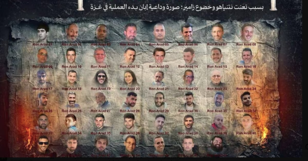Este sábado 20, el brazo armado de HamasLas brigadas Ezedín al-Qasam publicaron una foto con los rostros de 48 rehenes que supuestamente se conservan en el Tira de gaza.