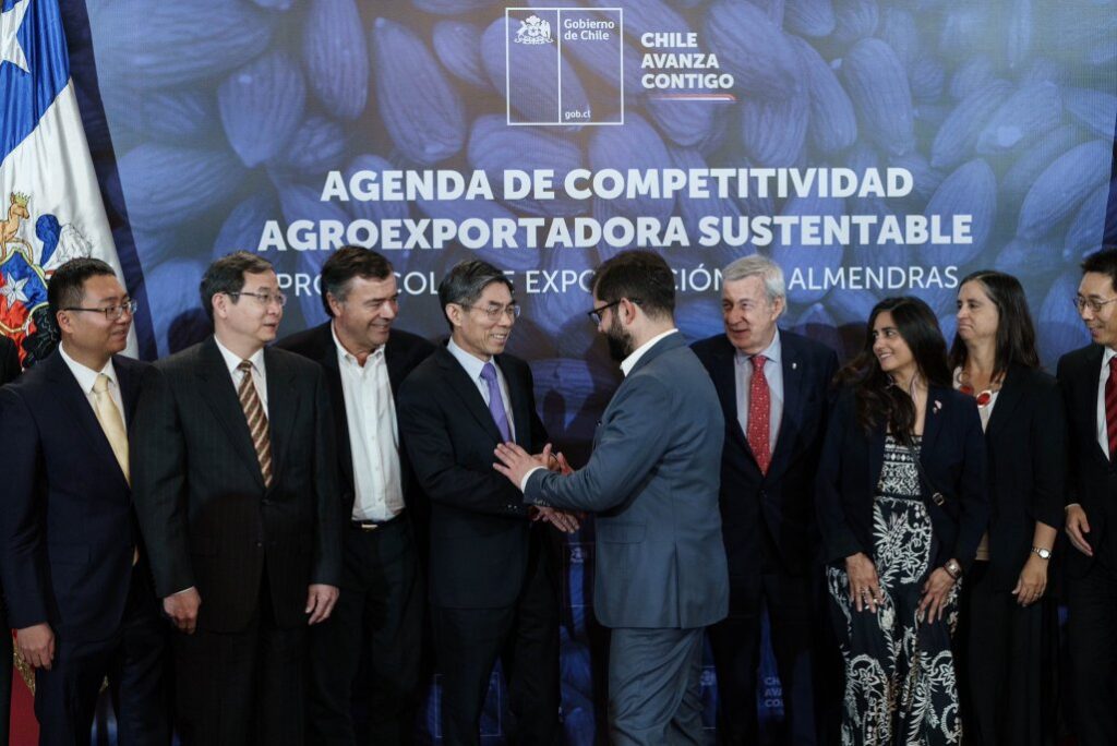 El viceministro de Aduanas de la República Popular de China, Wang Lingjun, y el ministro de Agricultura de Chile, Esteban Valenzuela, firmaron en La Moneda el protocolo que permitirá la exportación de almendras chilenas sin cáscara a ese país, lo que contribuirá a seguir expandiendo el comercio de frutas frescas chilenas al gigante asiático.