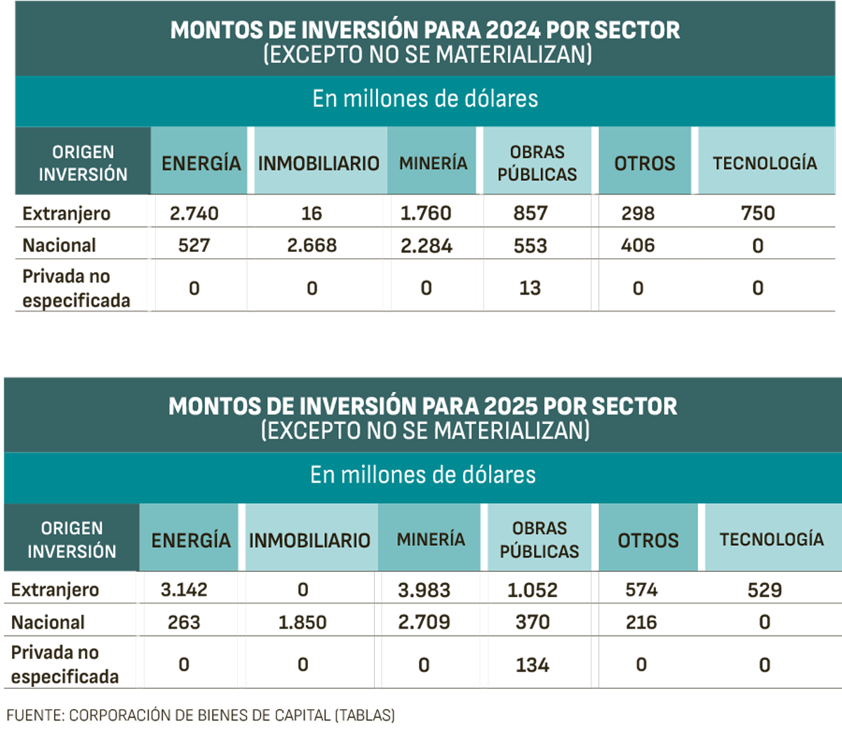 Según Hacienda, del total de montos de inversión comprometidos para 2024 (US$ 12.870 millones), el 50% corresponde a inversión extranjera y el resto a inversión nacional. Para 2025, el monto total de inversión que se materializará asciende a US$ 14.822 millones, de los cuales el 63% corresponde a inversión extranjera, el 36% a inversión privada nacional y el 1% a inversión privada no especificada.