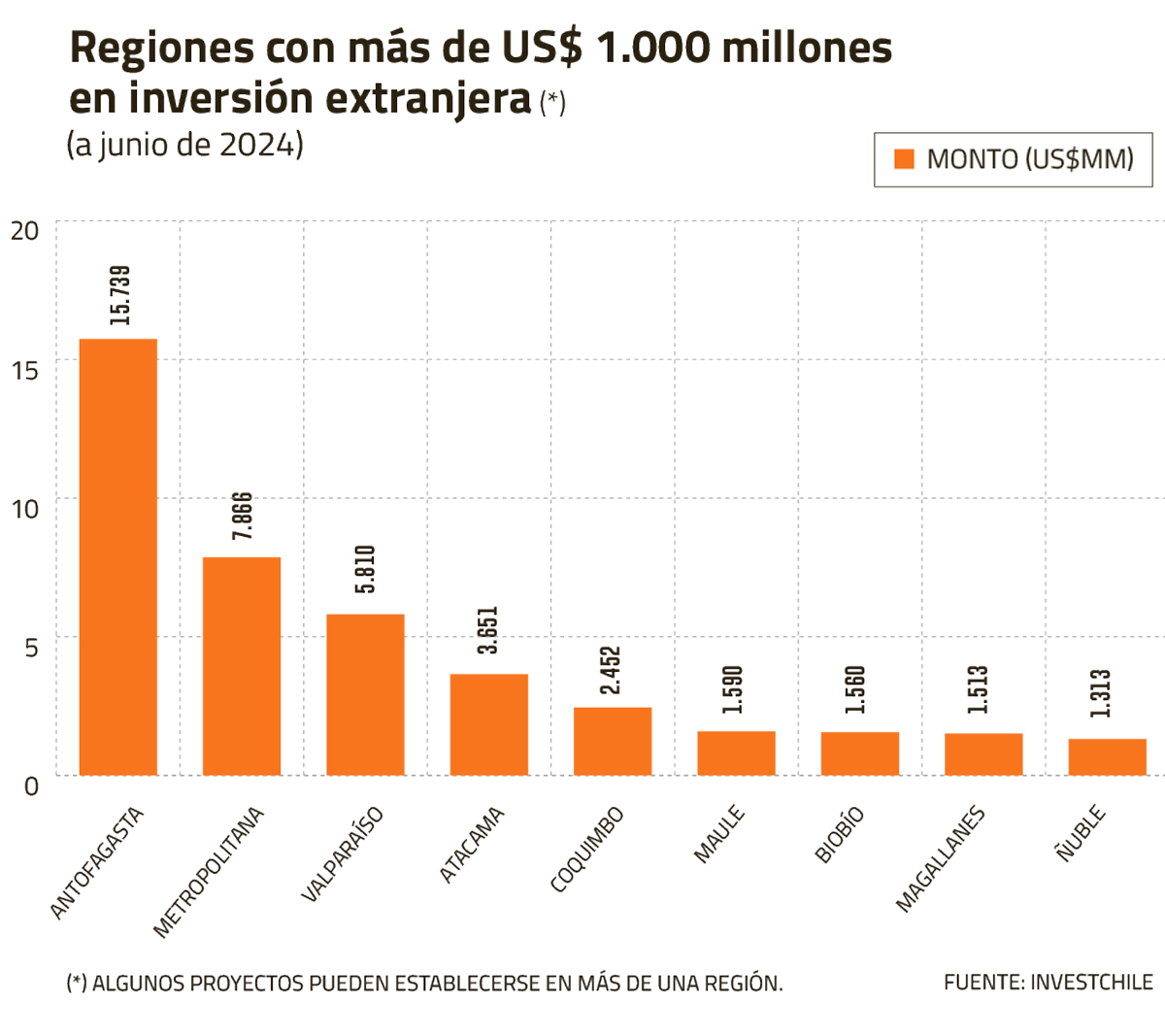 Además, y aunque algunos proyectos pueden establecerse en más de una región, del total de 16 regiones, nueve acumulan más de US$ 1.000 millones en proyectos de inversión extranjera, en diferentes etapas de desarrollo. De ellos, Atacama (3.651 millones de dólares), Coquimbo (2.452 millones de dólares), Maule (1.590 millones de dólares), Biobío (1.560 millones de dólares), Magallanes (1.513 millones de dólares) y Ñuble (1.313 millones de dólares). destacar. ).