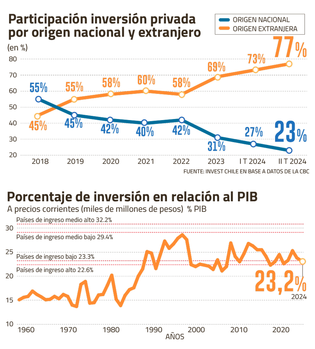 El salto más significativo se dio en los primeros seis meses de 2024. Según InvestChile, las cifras del primer semestre mostraron “que la participación de la inversión privada extranjera en el catastro del CBC alcanza el 77% (US$ 37.478 millones), mientras que la inversión privada nacional corresponde al 23% restante (US$ 11.193 millones). El panorama era totalmente diferente hace seis años, ya que en 2018 sólo el 45% de los proyectos contenidos en el informe provinieron de capital extranjero, frente al 55% de capital local.”