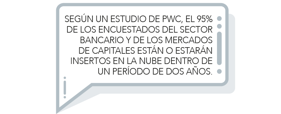 Según un estudio de PwC, el 95% de los encuestados en el sector bancario y de mercados de capitales están o estarán integrados en la nube dentro de un período de dos años. De ese porcentaje, el 38% ya estaba dentro y seguía subiendo, mientras que el 44% declaró estar parcialmente dentro.