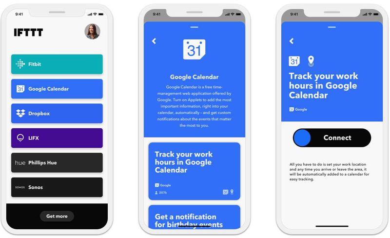 IFTTT puede combinar más de 700 servicios y aplicaciones, y automatizar cerca de 100.000 acciones según la necesidad del usuario. Por ejemplo, puede hacer que los enlaces de Instagram se muestren como una imagen completa en Twitter en lugar de un enlace al usuario, o activar el temporizador del dispositivo cada vez que se abre una aplicación de red social. Estas combinaciones entre aplicaciones se pueden utilizar para medir, facilitar, conectar o simplemente hacer que dos aplicaciones diferentes conversen para la comodidad del usuario. Además, controla y automatiza los dispositivos domésticos inteligentes que tienen Siri, sirviendo también como una aplicación de seguridad.