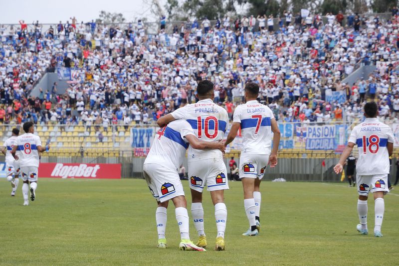 Los jugadores de la UC celebran el segundo gol ante el Everton, obra de César Pinares. FOTO: LEONARDO RUBILAR CHANDIA/AGENCIAUNO