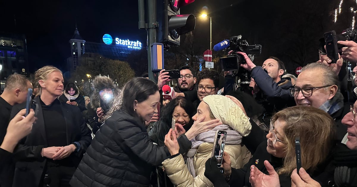 A la salida del Gran Hotel de Oslo, el líder opositor venezolano Se acercó a las vallas dispuestas por la policía local y estrechó manos y abrazó a quienes estaban detrás de ellas.mientras se escuchaban gritos de aliento y ella seguía lanzando besos al público presente.