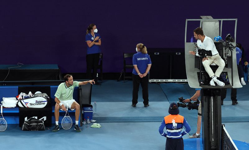 Medvedev protestando por el entrenamiento del padre de Tsitsipas en el Abierto de Australia de este año (REUTERS/Loren Elliott)