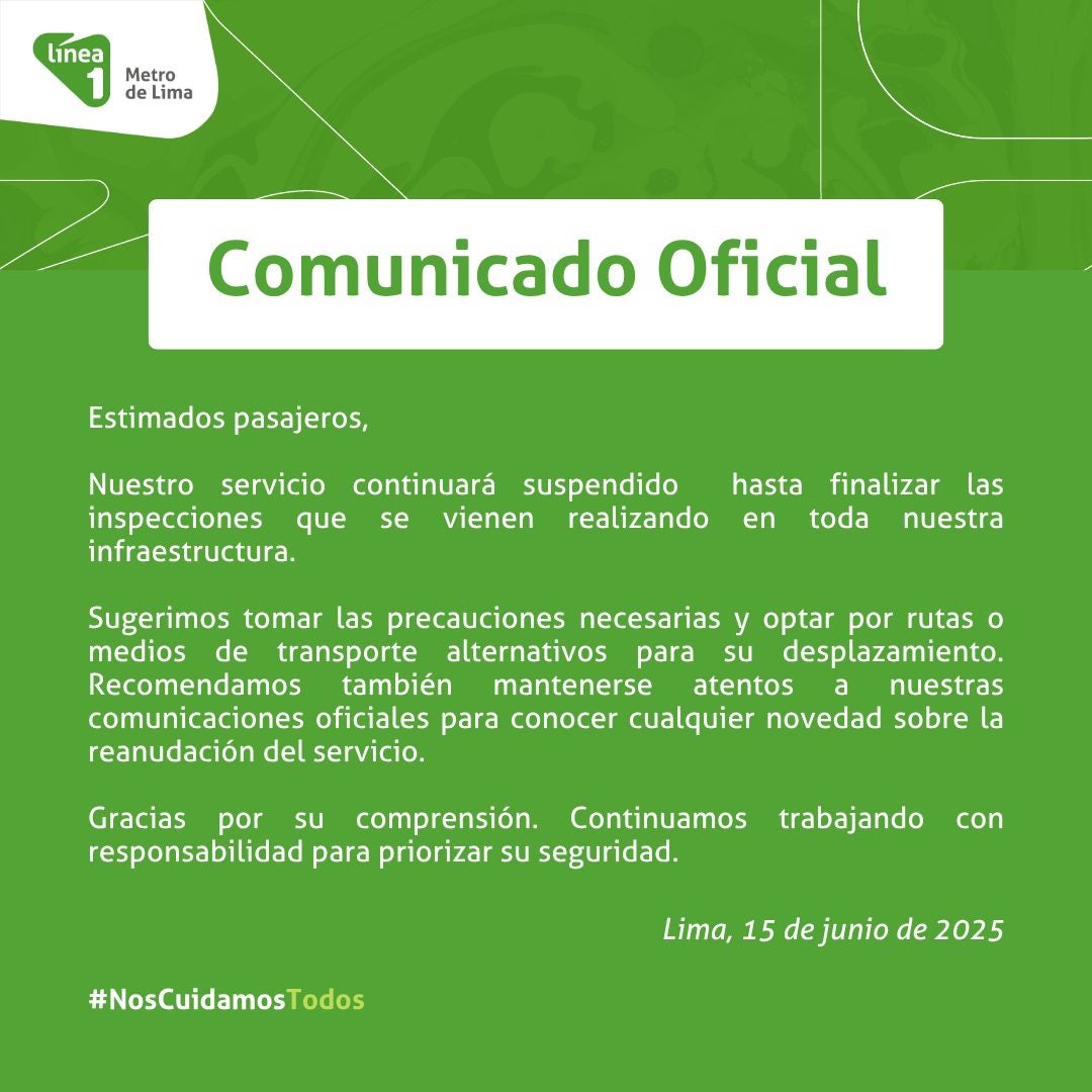 El Lima One Line One Emitió una nueva declaración este domingo para informar que el servicio permanecerá suspendido hasta que las inspecciones realizadas en todas sus infraestructuras se completen. Esto después del terremoto 6.1 que ha dejado daño material en Lima y Callao.