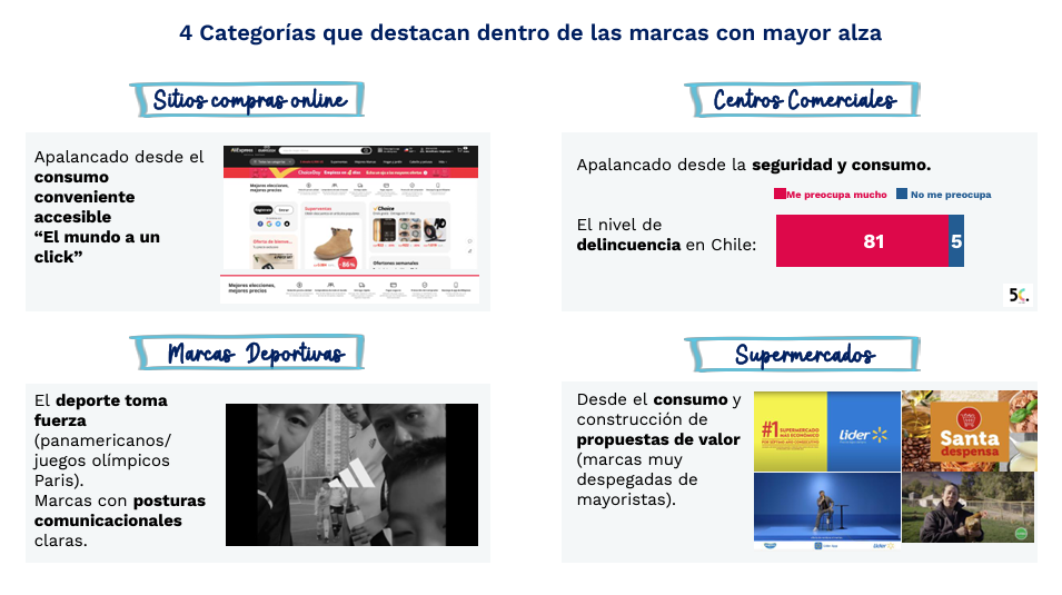 Otra sorpresa que arrojó el estudio fueron las cuatro categorías destacadas entre las marcas con mayor crecimiento. Estas fueron: sitios de compras online, que se benefician del consumo rápido y conveniente; centros comerciales, valorados por el “consumo seguro” según el 81% de los encuestados que expresaron preocupación por la delincuencia; marcas deportivas, atribuido a los eventos deportivos recientes en el país junto a sus compromisos sociales; y supermercados, que se han posicionado gracias a su estrategia de valor frente a los mayoristas.