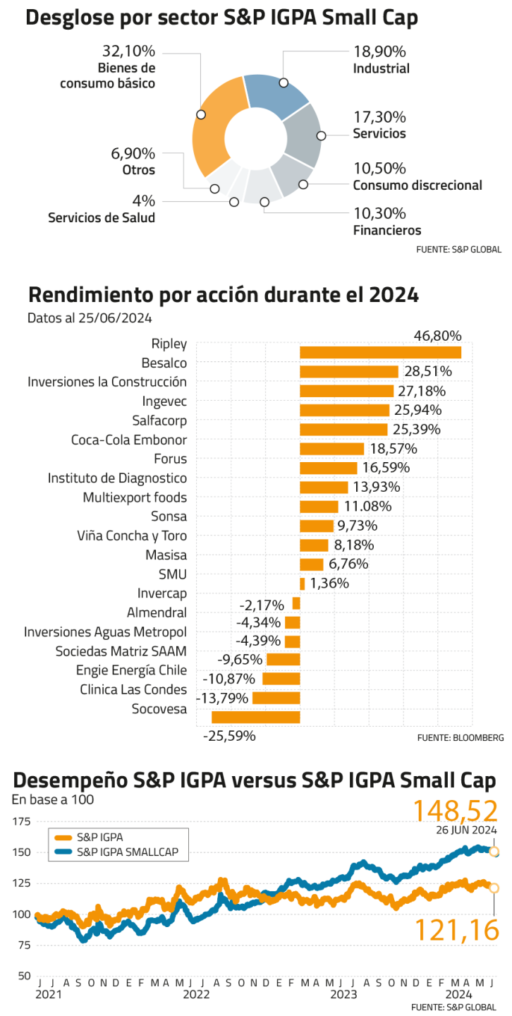 De las 20 acciones que componen el índice small cap, nueve anotan rendimiento de dos dígitos en lo que va del 2024, siendo Ripley la que lidera el ranking con un aumento del 46,5% en el precio de sus papeles.