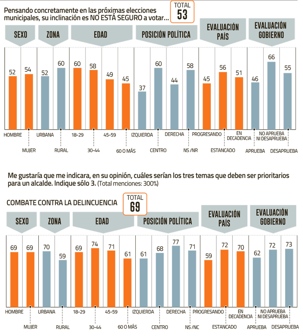 Quienes eligieron la delincuencia como prioridad para los alcaldes son en su mayoría de zonas urbanas (70%), entre 30 y 44 años (74%), consideran que el país está estancado (72%) y desaprueban al Gobierno (73%).