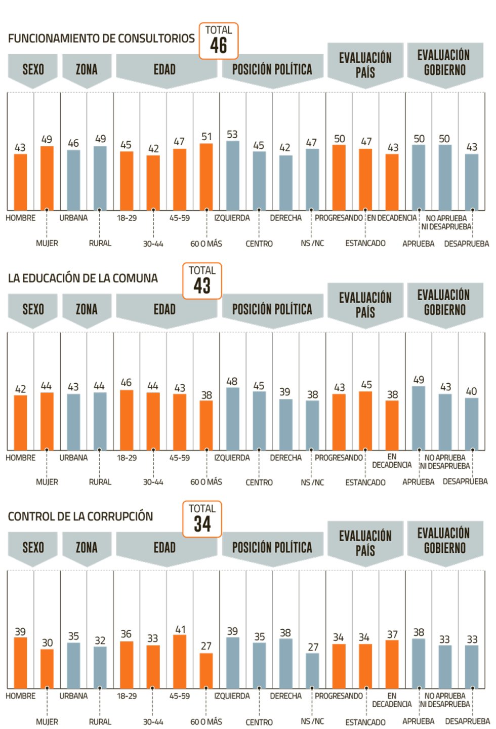Precisamente, cuando se les preguntó sobre los temas públicos que deberían ser prioridad para un alcalde, la mayoría de los encuestados eligió la lucha contra el crimen (69%), seguido del funcionamiento de clínicas (46%), la educación de la comuna (43%). ) y el control de la corrupción (34%).