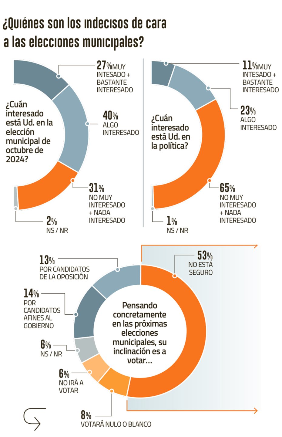 El porcentaje supera el 14% que declaró que se inclinará por candidatos afines al Gobierno y el 13% por candidatos opositores; y, también se distancia del 8% de encuestados que dijeron que optarán por marcar nulo o blanco y el 6% que no acudirá a las urnas.