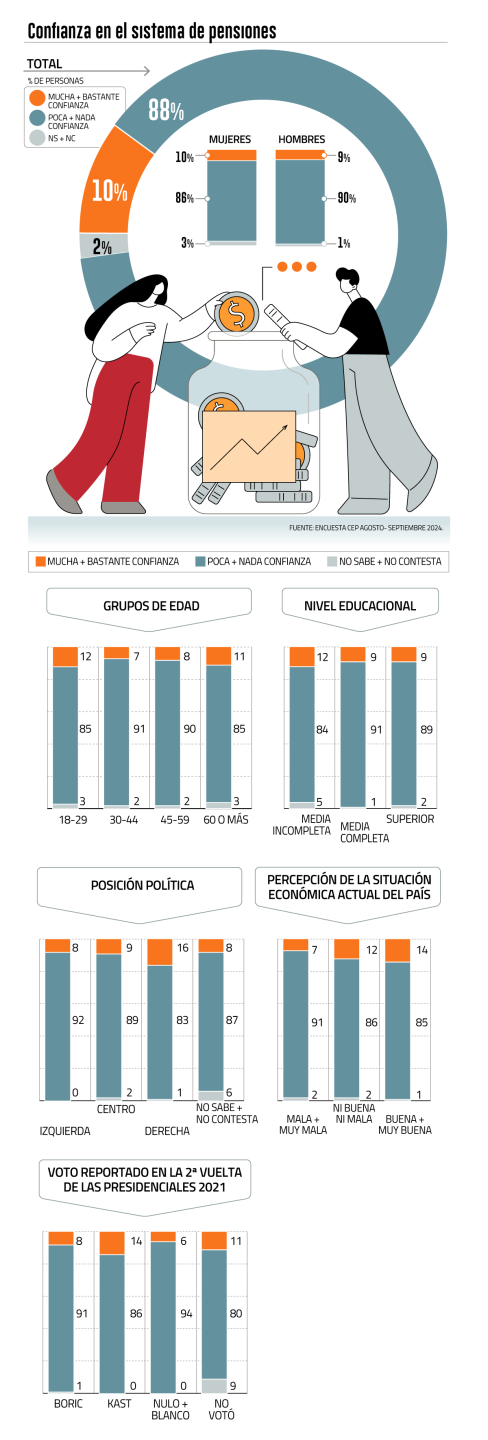 El estudio de opinión pública sostuvo que Sólo un 10% de los encuestados se mostró a favor de las opciones “mucha” o “bastante” de confianza en el sistema de pensiones. Chileno. Mientras, El 88% indicó que tiene “poca” o “nada” confianza y el 2% restante no sabe o no responde.