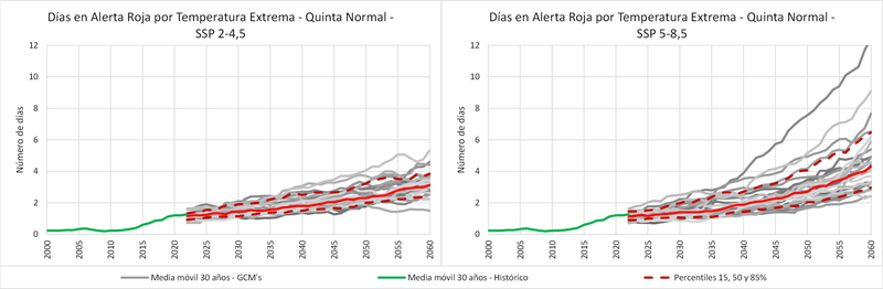 Las proyecciones de media móvil de 30 años según la Quinta Estación Normal de días en Alerta Roja (temperatura máxima mayor o igual a 35°C) hasta 2060 y 2100, estimadas a través de modelos de cambio climático para dos posibles escenarios de emisión, SSPs 2-4.5 y 5-8.5, representante de un negocio como de costumbre y en el peor de los casos, presentan resultados que dependen fuertemente del escenario de emisiones de gases de efecto invernadero considerado, mostrando una mayor diferencia e incertidumbre hacia finales de siglo.