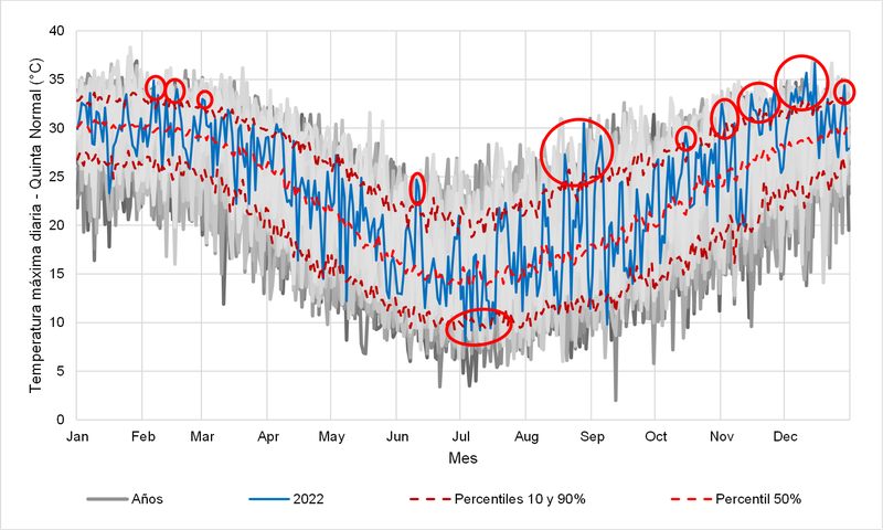 Temperatura máxima 2022 y su contexto histórico para la estación Quinta Normal.