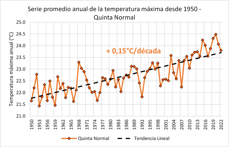 “Si consideramos la estación meteorológica Quinta Normal y comparamos las temperaturas máximas promedio del período 1950-1979 con las de los últimos 30 años, podemos ver que estas han aumentado en 1,1°C, mostrando un aumento del orden de 0 0,15 °C/década”, dice Ignacio Toro, ingeniero y Diplomado en Cambio Climático y Desarrollo Bajo en Carbono de la Universidad de Chile.